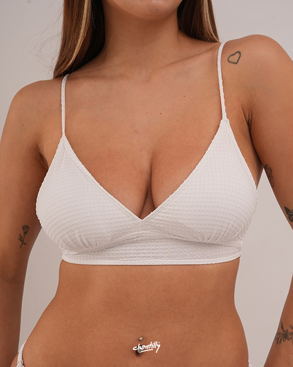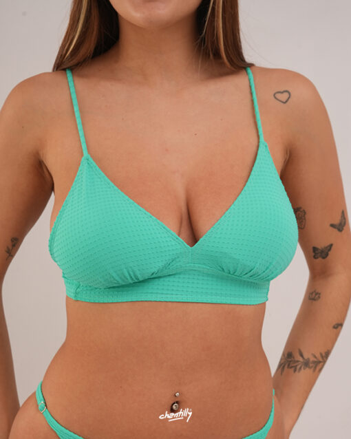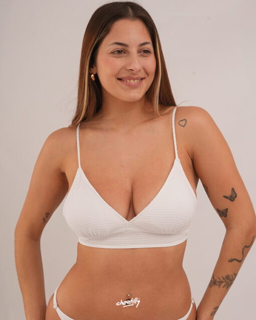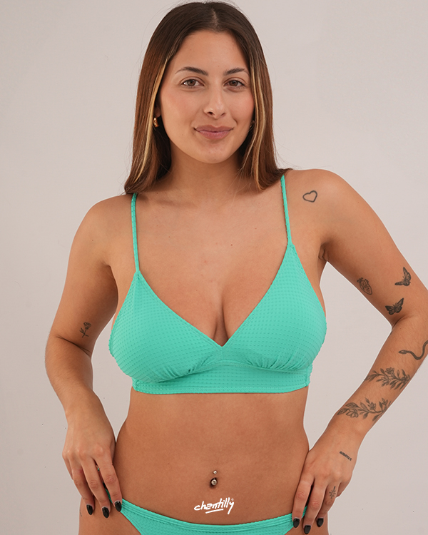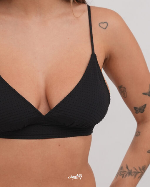 Este corpiño es para quienes buscan la estética de un triangulito pero sin renunciar a la seguridad que les da una base fija,