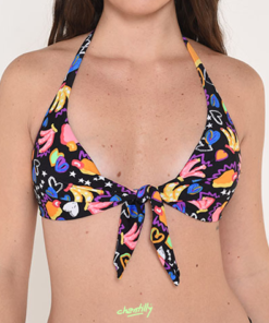 El corpiño se conforma de dos partes, se ata en el cuello, en el centro del busto y en la espalda, lo que es un WIN en todo sentido a la hora de que la clienta pueda adaptarlo a su busto.